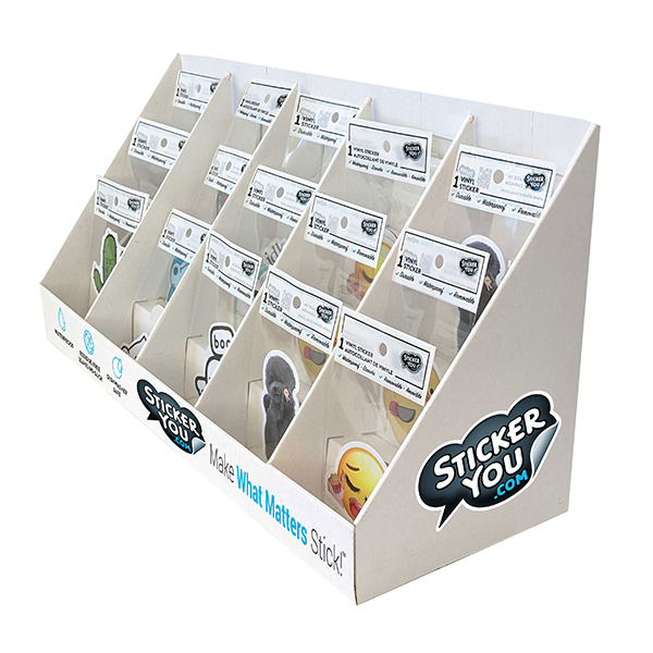 Can contain 15 different sticker models. Cost of display is offset with free stickers at retail value