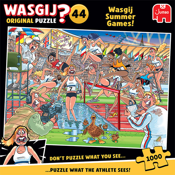 It’s all ready, set, go at the Wasgij Summer Games. The crowd in the stadium are on their feet, the press and cameras are at the trackside, the athletes are… uh-oh! They’re running all over the place! Something unexpected is putting our steeplechasers off their stride. What could the athletes have seen that’s so distracting? Has all the training paid off, or is an unexpected competitor about to go for gold? That is the scene you will need to puzzle. The original concept plays on the theme, ‘Have you got eyes in the back of your head?’ This means that the puzzle image shows what the characters on the box are actually looking at. You must use your imagination and the clues on the box to try and solve the puzzle and discover what they can see… Only the puzzle holds the answer!1000 pcs