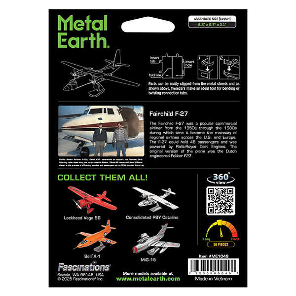 The Fairchild F-27 was a popular commercial airliner from the 1950s through the 1980s during which time it became the mainstay of regional airlines across the U.S. and Europe. The F-27 could hold 48 passengers and was powered by Rolls-Royce Dart Engines. The original version of the plane was the Dutch engineered Fokker F27.