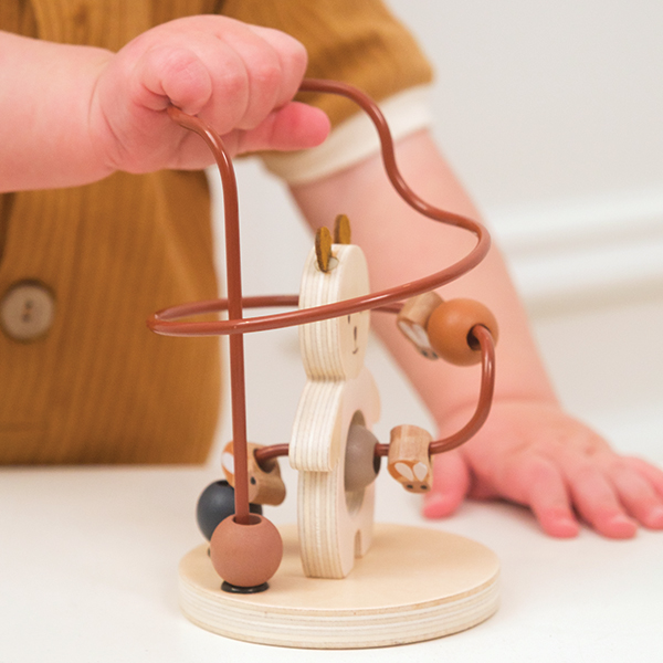 A little spiral of focus and fun. This wooden wire game invites tiny hands to guide beads along smooth curves, discovering movement and rhythm as they play. Designed to build fine motor skills and calm concentration — a charming first toy inspired by Marcel’s gentle world.