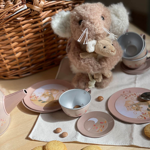 Invite all your friends over for tea. Retro tin tea set with 4 cups and saucers, a lovely tea pot, spoons and a napkin. Watch the cute mouse design. 3 years+