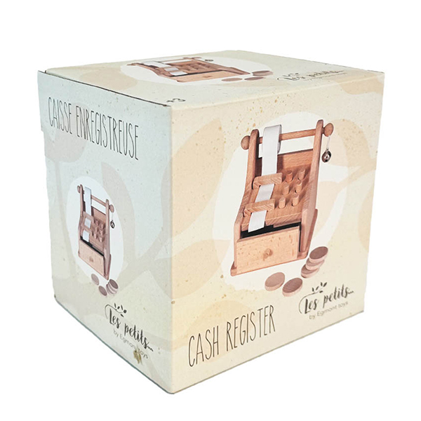 Absolutely indispensible for the shop, the cash register in natural beech wood. Register your sales, add everything on the receipt and ring the bell to open the drawer. 3 years+
