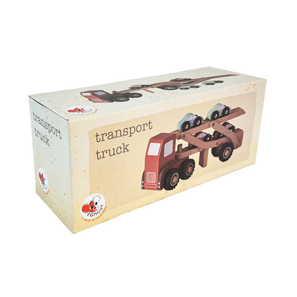 Sturdy wooden car transport truck with 4 wooden cars. Watch out, here comes your new car! Load and unload. Hours of fun. 3 years+