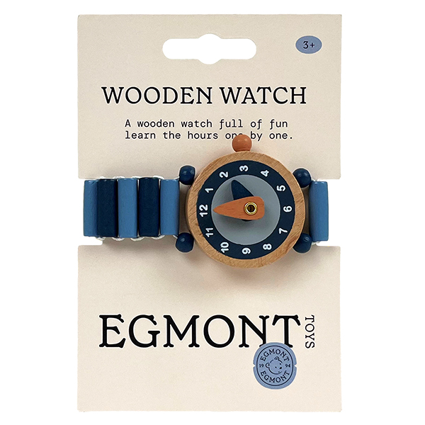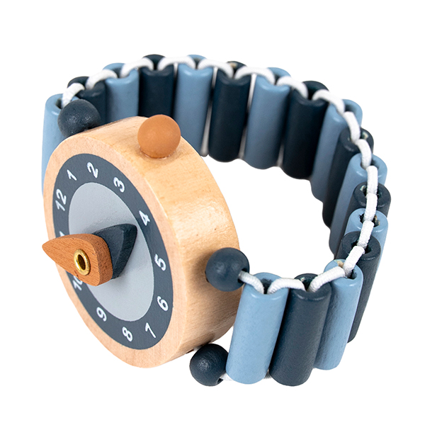 Learning to tell time feels natural with clear white numbers and movable peach-coloured hands. The flexible elastic strap fits perfectly, whilst the alternating wood and blue segments create a charming, durable design.