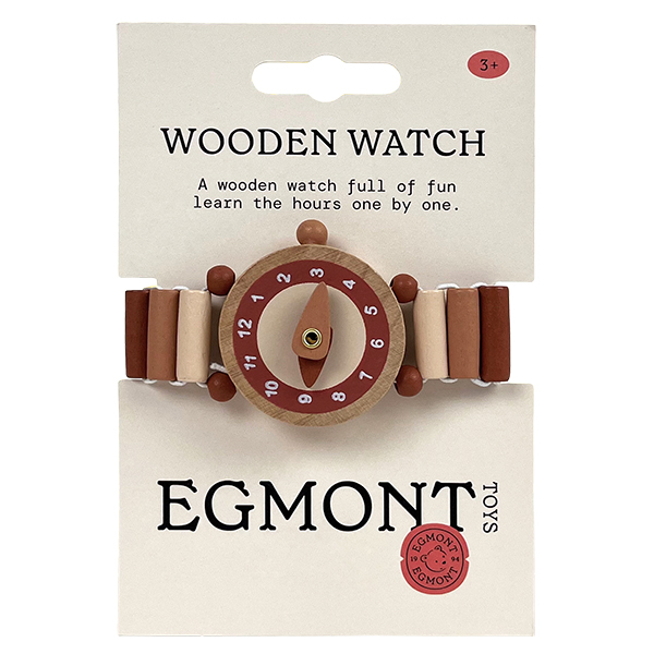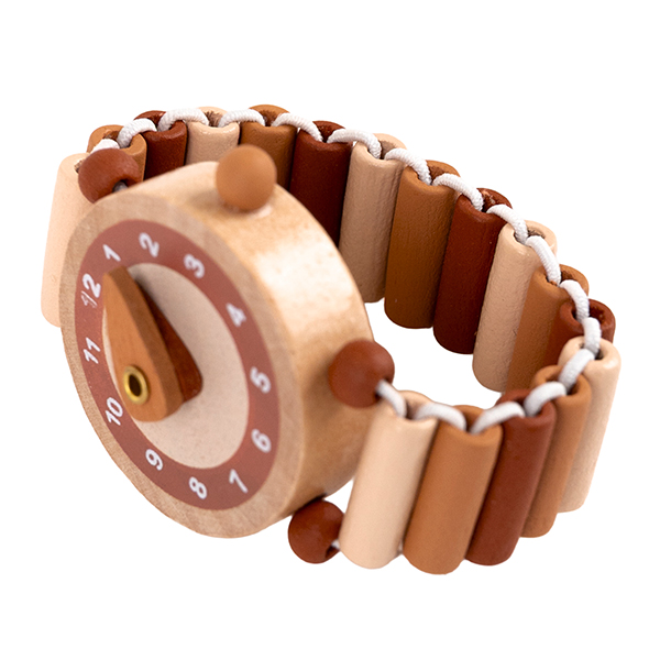 Learning to tell time feels natural with clear white numbers and movable peach-coloured hands. The flexible elastic strap fits perfectly, whilst the alternating wood and blue segments create a charming, durable design.