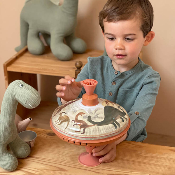 This metal Dino top is a classic. Pull and push on the handle and watch the top spin with a nice buzzing sound. Hours of fun guaranteed. 10 months+