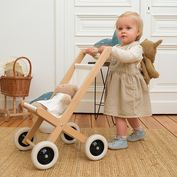 Amandine's dolls are so happy to go on a stroll in this lovely wooden buggy with its natural cotton lining. Manufactured in Germany, very robust and adapted for all kinds of roads.