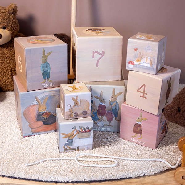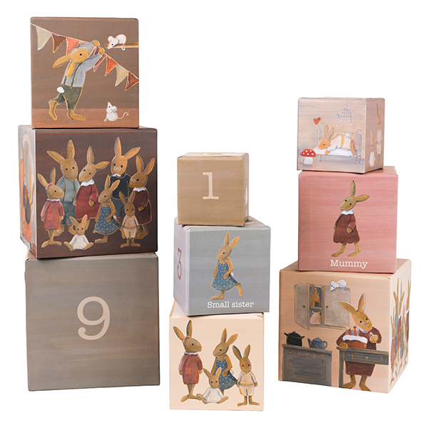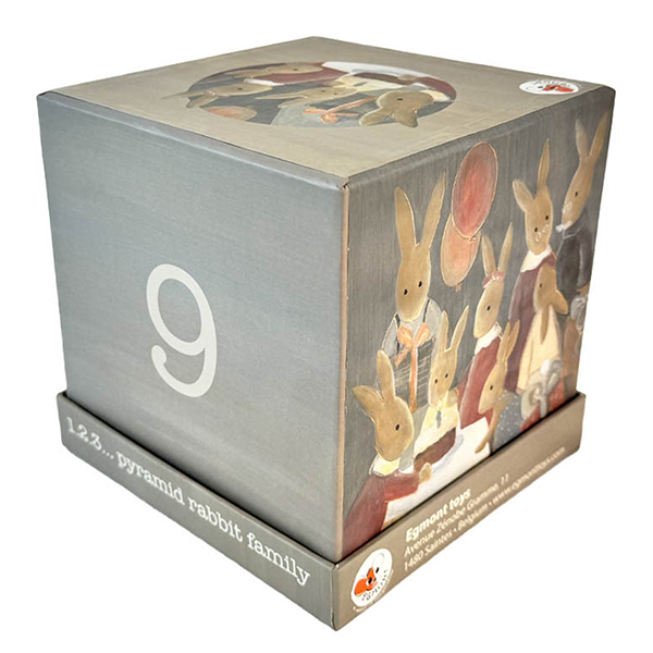 9 carton cubes with illustrations of the rabbit family. From the tiniest baby till the grandfather. Stack the cubes, learn to count, topple them or use them to hide your treasures…moments of shared pleasure and laughter for young and old. FSC Carton