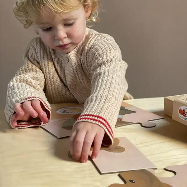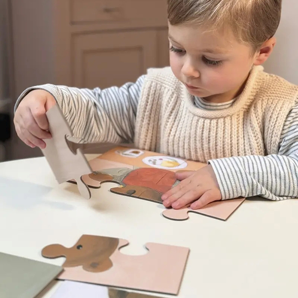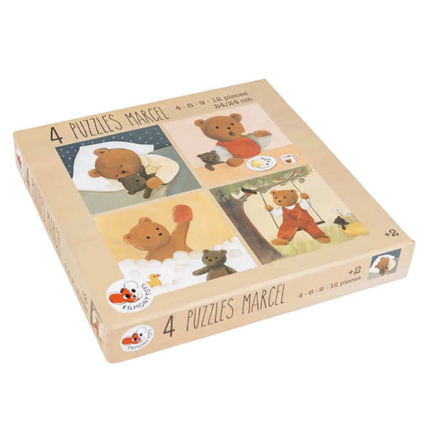 4 puzzles of 4, 6, 9 and 12 pieces to follow Marcel the bear on his daily tasks and to help the development of the little ones. + 2 years