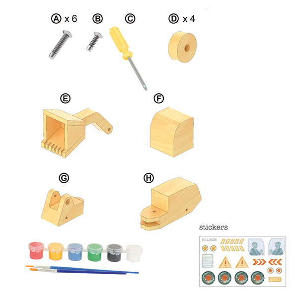 Assemble, paint and decorate. Follow the instructions and build a wooden bulldozer. Wooden parts, screwdriver, paint, brush and stickers. Everything is included. +6Y.