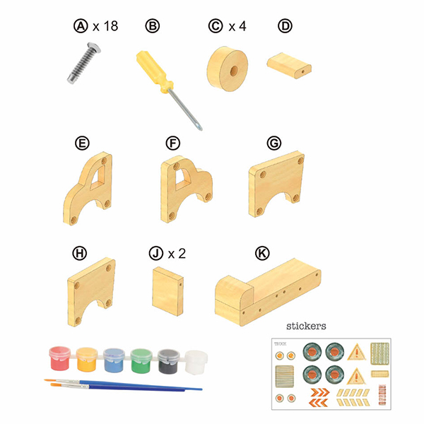 Assemble, paint and decorate. Follow the instructions and build a wooden truck. Wooden parts, screwdriver, paint, brush and stickers. Everything is included. +6Y.