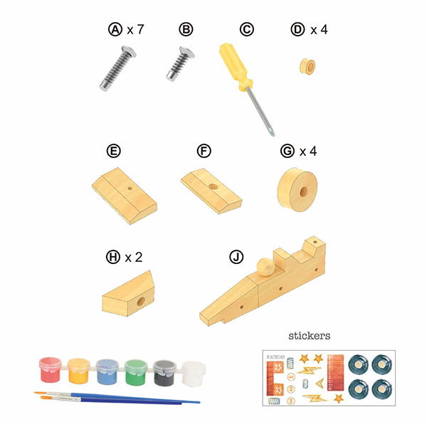 Assemble, paint and decorate. Follow the instructions and build a wooden racecar. Wooden parts, screwdriver, paint, brush and stickers. Everything is included. +6Y.