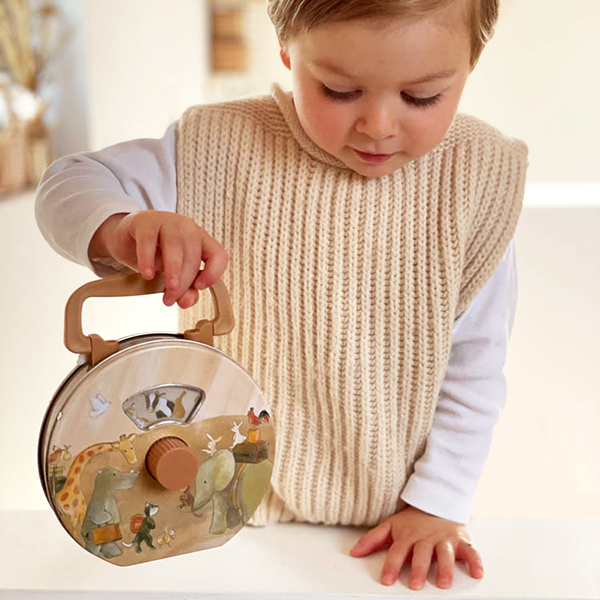 Turn the button to the right and the music starts to play, while the animals start the parade. No batteries and so, more sustainable. 3 years+