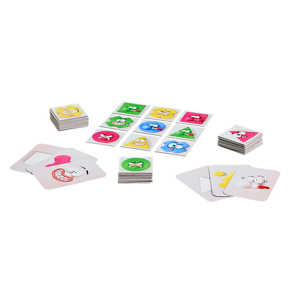 Vous pouvez réaliser 1 carte objectif à tout moment, quel que soit le joueur dont c'est le tour. Si un critère (couleur, forme ou face) de l'une de vos cartes objectif apparaît 3 fois dans une ligne horizontale, verticale ou diagonale dans l'affichage commun, vous pouvez montrer la carte objectif correspondante et la placer face visible devant vous.